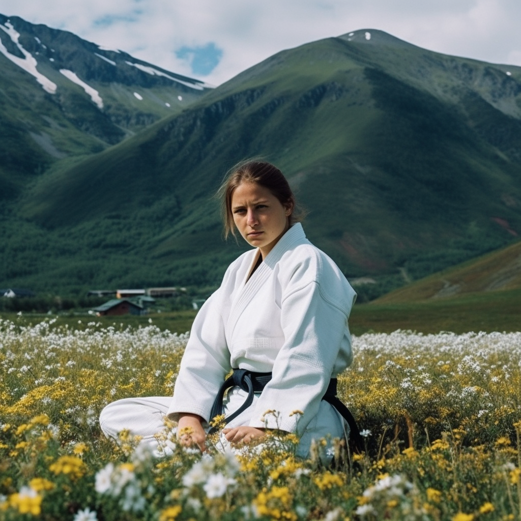 PROMPT woman, judoka, sitting on a field with flowers, mountains